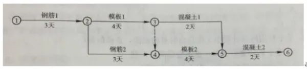 解析:通過模板1和鋼筋2兩項(xiàng)工作的比較,兩者工作時(shí)間相差1天。由于鋼筋2工作延誤3天,關(guān)鍵線路會(huì)轉(zhuǎn)移,變成1-2-4-5-6,總持續(xù)時(shí)間為15天(3天+6天+4天+2天),比原計(jì)劃(13天)延長2天。