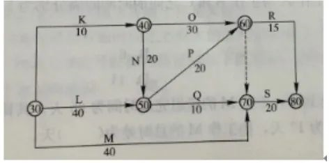解析:原關(guān)鍵線路為L→P→S:40+20+20=80天;延誤后關(guān)鍵線路為K-→N→p→S:35+20+20+20=95天,影響工期為增加15天。
