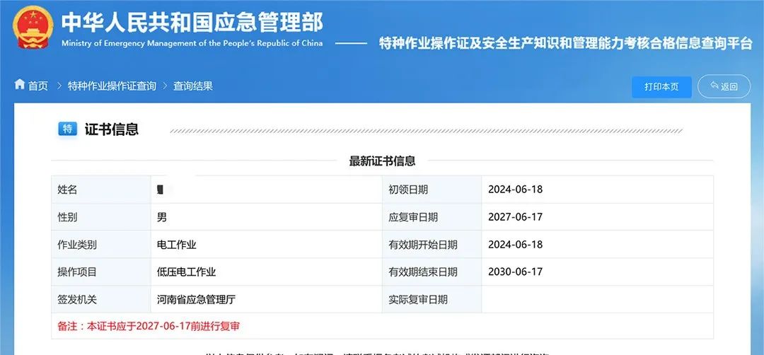 ② 全國聯網查詢:所有證書可通過應急管理部政府網站(地址:http://cx.mem.gov.cn/)進入“特種作業操作證及安全生產知識和管理能力考核合格信息查詢”系統查驗真偽。