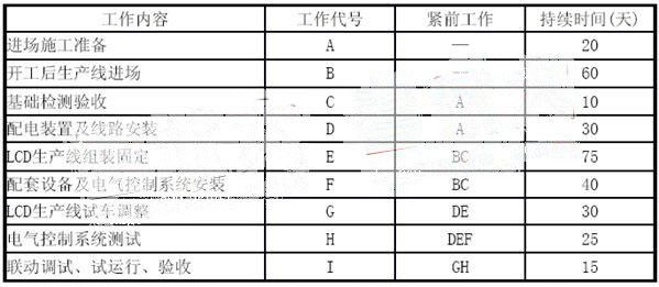 2006(二)南方電子電氣有限公司(建設(shè)單位)新建液晶屏(LCD)生產(chǎn)車間,其生產(chǎn)線由建設(shè)單位從國外訂購,A 施工單位承包安裝。A 施工單位進(jìn)場時,生產(chǎn)車間的土建工程和機(jī)電配套工程(B 施工單位承建)已基本完工。A 施工單位按合同工期要求,與建設(shè)單位、生產(chǎn)線供應(yīng)商和B施工單位洽談,編制了LCD 生產(chǎn)線安裝網(wǎng)絡(luò)計劃工作的邏輯關(guān)系及工作持續(xù)時間表(見下表)。LCD 生產(chǎn)線安裝網(wǎng)絡(luò)計劃工作邏輯關(guān)系及持續(xù)時間表