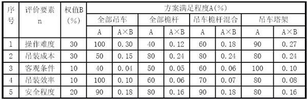1.根據(jù)技術(shù)經(jīng)濟(jì)分析表,運用綜合評價法選定最優(yōu)的吊裝方案。