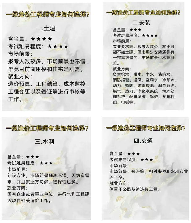 一造的專業(yè)分為土木建筑工程、交通運(yùn)輸工程、水利工程和安裝工程4個(gè)專業(yè)類別,考生在報(bào)名時(shí)可以根據(jù)實(shí)際工作需要選擇一個(gè)專業(yè)進(jìn)行報(bào)考。