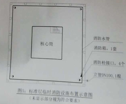 “在建工程施工防火技術(shù)方案”中,對已完成結(jié)構(gòu)施工樓層的消防設(shè)施平面布置設(shè)計(jì)見圖5。圖中立管設(shè)計(jì)參數(shù)為:消防用水量15L/s,水流速ⅰ=15m/s;消防箱包括消防水槍、水帶與軟管。監(jiān)理工程師按照《建筑工程施工現(xiàn)場消防安全技術(shù)規(guī)范》(GB50720-2011)提出了整改要求。