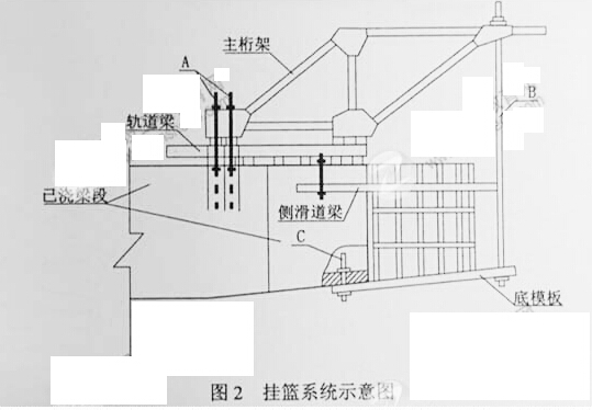 1.掛藍系統中A:錨固裝置;B:前吊裝置;c:后吊裝置。 接平衡方式劃分,該掛籃屬于自錨式