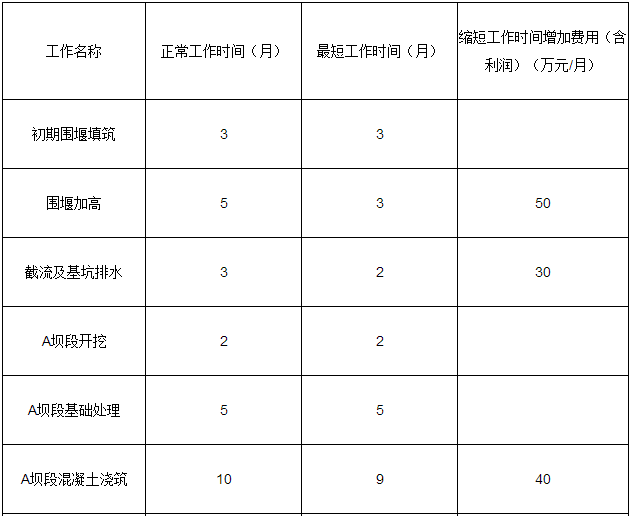 事件一:由于發(fā)包人未按時提供施工場地,造成了開工時間推遲,導致“初期圍堰填筑”的延誤,經(jīng)測算“初期圍堰填筑”要延至2012年1月30日才能完成。承包人據(jù)此向監(jiān)理人遞交了索賠一項通知書,后經(jīng)雙方協(xié)商達成如下事項:(1)截流時間推遲到2012年2月1日;(2)“圍堰加高”須在2012年5月30日(含5月30日)前完成;(3)完工日期不變,調(diào)整進度計劃;(4)發(fā)包人依據(jù)工期—費用表(如表2所示),重新編制新的施工進度計劃,并提交了趕工措施和增加的費用,上報監(jiān)理人并批準。