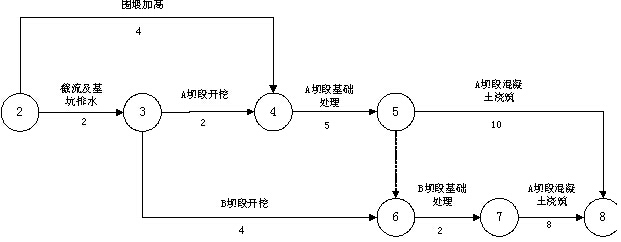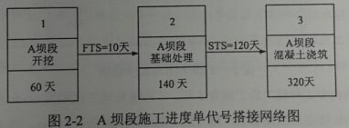 事件三:結合現(xiàn)場及資源情況,承包人對新的施工進度計劃進行了局部調(diào)整,A壩段采用搭接施工,其單代號搭接網(wǎng)絡如圖2-2所示: