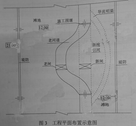 事件一:施工單位根據(jù)本工程具體條件和總體進度計劃安排,提出的施工導流方案如圖3所示。工程附近無現(xiàn)有河道可供施工導流,施工單位采用的導流方案為一次攔斷河床(全段)圍堰法施工,具體施工組織方案是在一個非汛期施工完成擴建新閘和加固老閘,在新閘和老閘上、下游填筑施工圍堰,期間利用新挖導流明渠導流。監(jiān)理單位審核后,認為開挖導流明渠工程量較大,應結合現(xiàn)場條件和總體工期安排,優(yōu)化施工導流方案和施工組織方案。