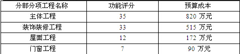 18.對(duì)某個(gè)項(xiàng)目的各項(xiàng)分部工程進(jìn)行功能評(píng)分如下,計(jì)算得出相應(yīng)各項(xiàng)的預(yù)算成本:從上表中數(shù)值看出,( )成本比重偏高,應(yīng)做重點(diǎn)分析,尋求降低成本的措施。