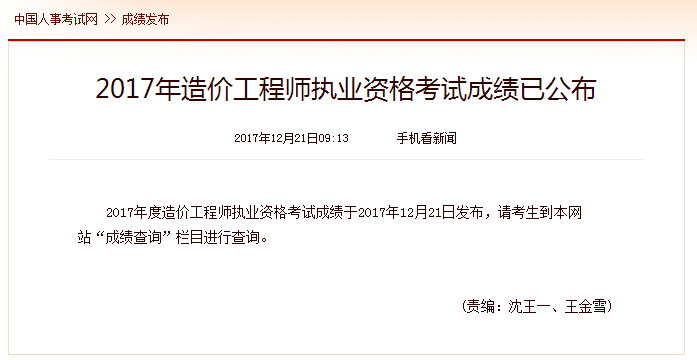 2017年造價工程師執(zhí)業(yè)資格考試成績可查了!