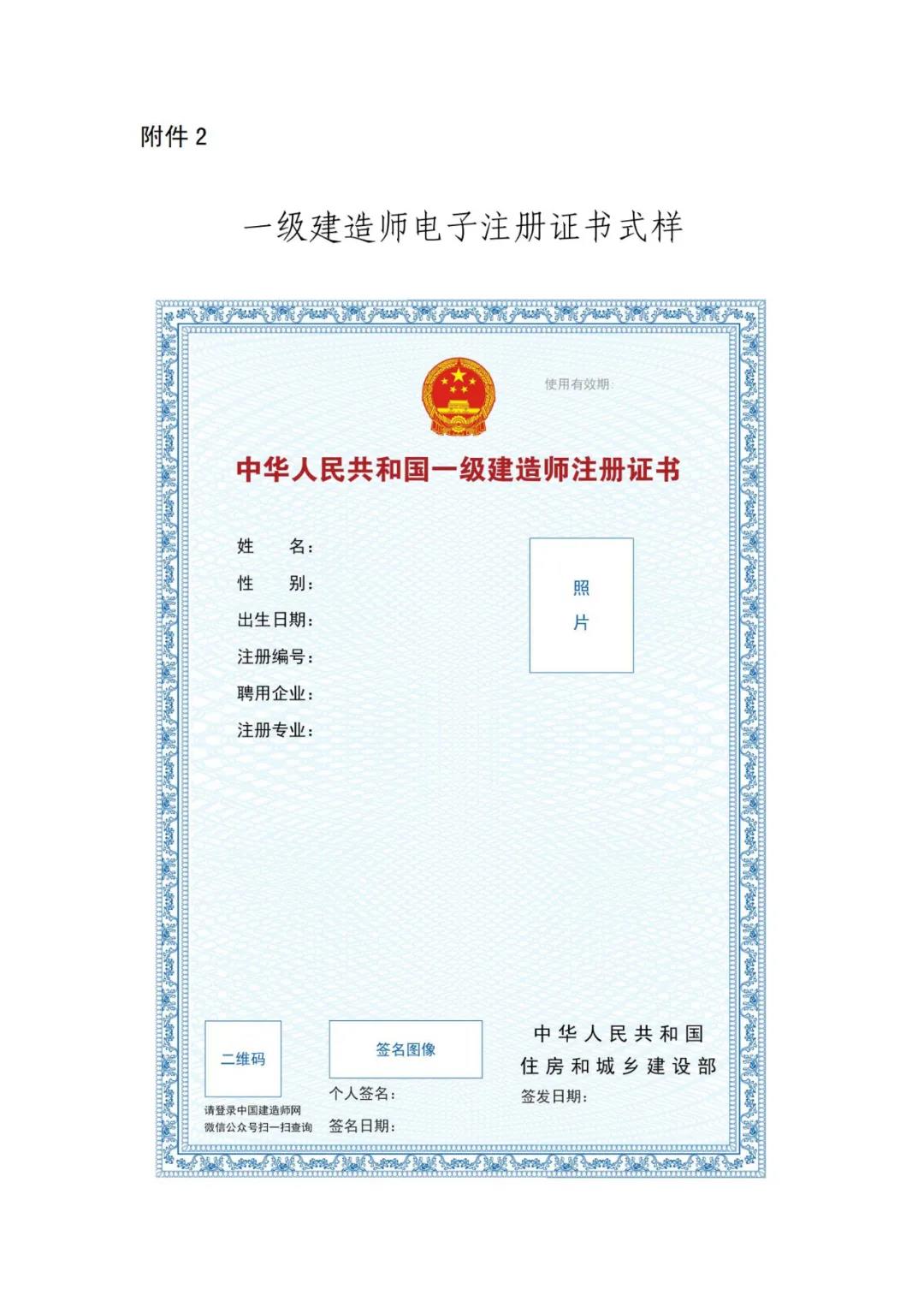2.自2021年8月1日起,河北等15個省(區、市)及前期開展試點的北京等4個省(市)準予一級建造師初始注冊、增項注冊、重新注冊、延續注冊的,不再發放紙質注冊證書或加貼防偽貼;聘用單位基本信息修改的,不再加貼防偽貼;因紙質注冊證書遺失、污損或個人信息修改等需重新發放注冊證書的,不再補發或更換紙質注冊證書。自2022年1月1日起,上述省(區、市)統一使用電子證書,紙質注冊證書作廢。