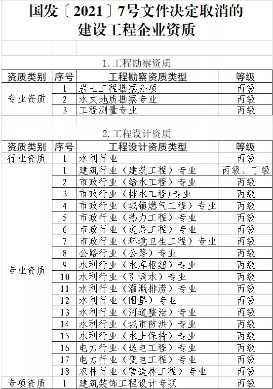 附件:國發〔2021〕7號文件決定取消的建設工程企業資質