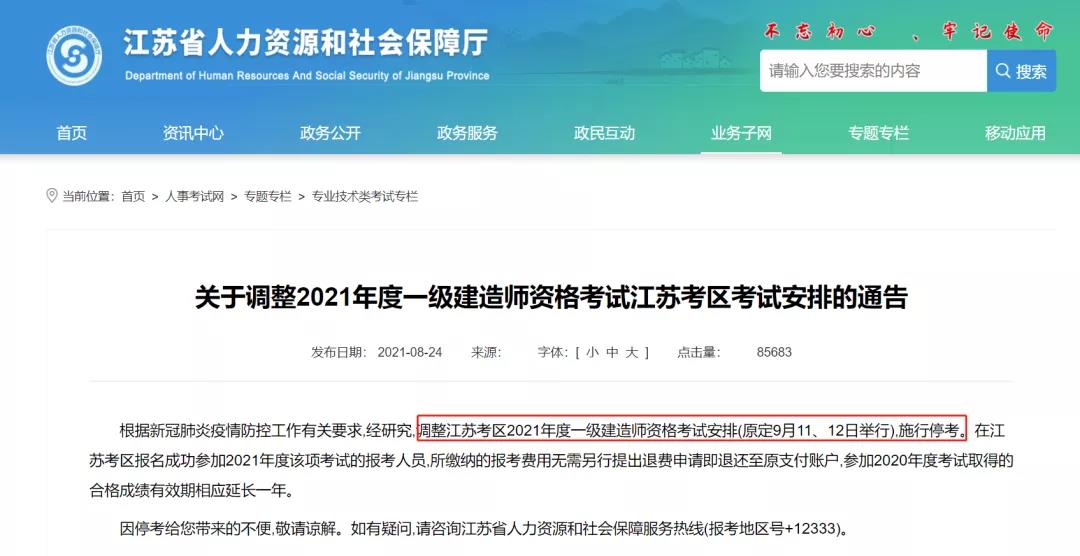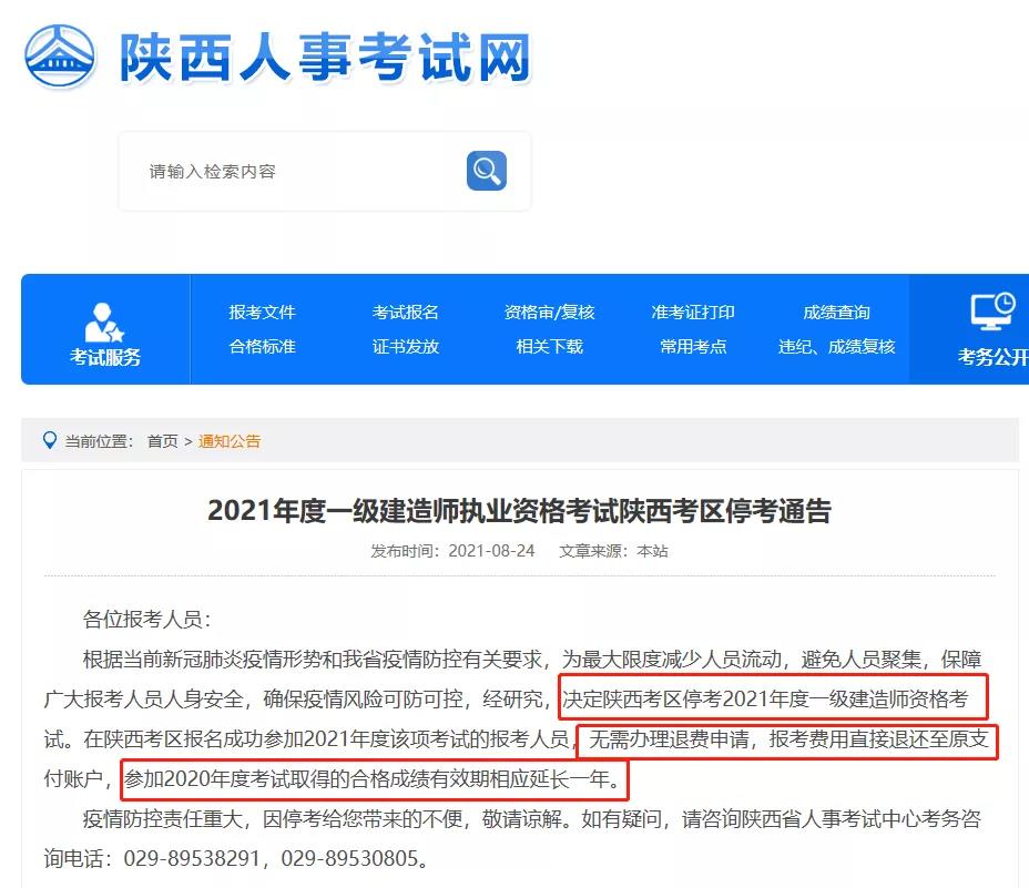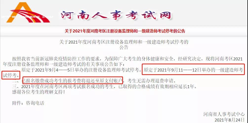 重磅消息!河南人事考試網(wǎng)、陜西人事考試網(wǎng)和江蘇省人社廳今日發(fā)布通告,河南、陜西、江蘇三地2021年一級(jí)建造師考試停考,報(bào)考費(fèi)用直接退還,2020年考試取得合格成績(jī)有效期延長(zhǎng)一年。以下是通告原文。