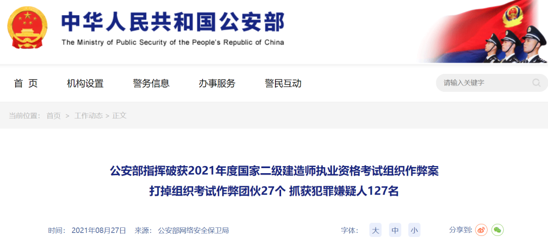 近日,按照公安部統(tǒng)一指揮部署,江蘇、湖北、江西等多省市公安機(jī)關(guān)對2021年度國家二級建造師執(zhí)業(yè)資格考試(以下簡稱二建考試)組織作弊案進(jìn)行偵辦, 一舉打掉組織考試作弊團(tuán)伙27個(gè),抓獲犯罪嫌疑人127名 ,查獲一批作弊考生,及時(shí)鏟除了試題泄露源頭,有效消除了試題泄露安全隱患,有力維護(hù)了公平公正考試秩序。