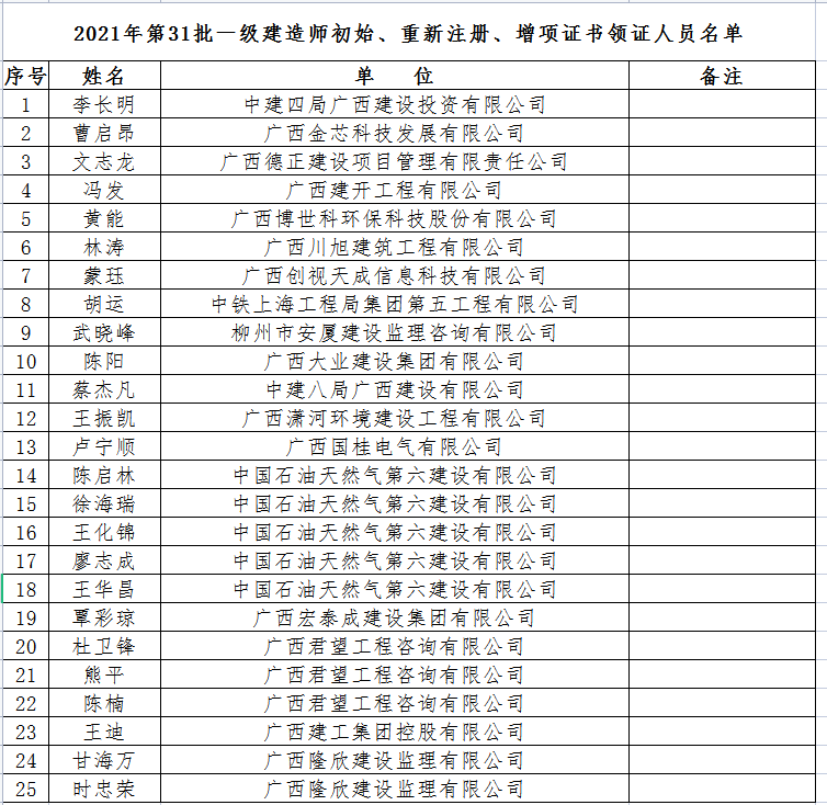 附件:2021年第31批一級建造師初始、增項、重新注冊證書領取人員名單
