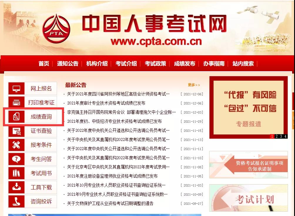 登錄中國(guó)人事考試網(wǎng)http://www.cpta.com.cn/index.html,點(diǎn)擊【成績(jī)查詢】