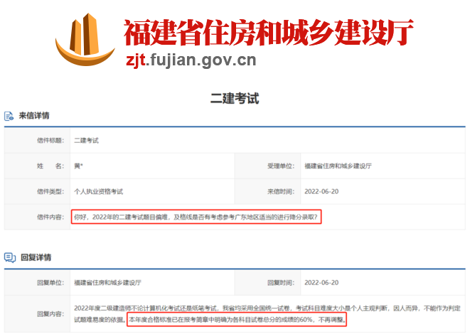 官方:福建2022年二建合格標準為60%!