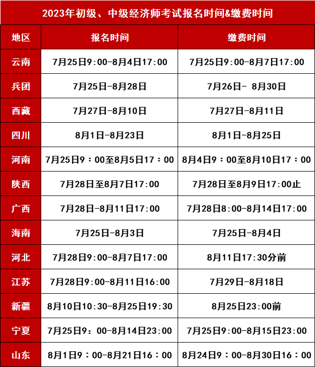 截止今日,共有13個地區發布了2023年初、中級經濟師報考通知,明確了經濟師的報名時間及各項要求。這13個地區分別是廣西、四川、海南、云南、西藏、兵團、江蘇、河北、新疆、寧夏、山東、河南、陜西。具體的報名時間安排和繳費時間如下圖所示: