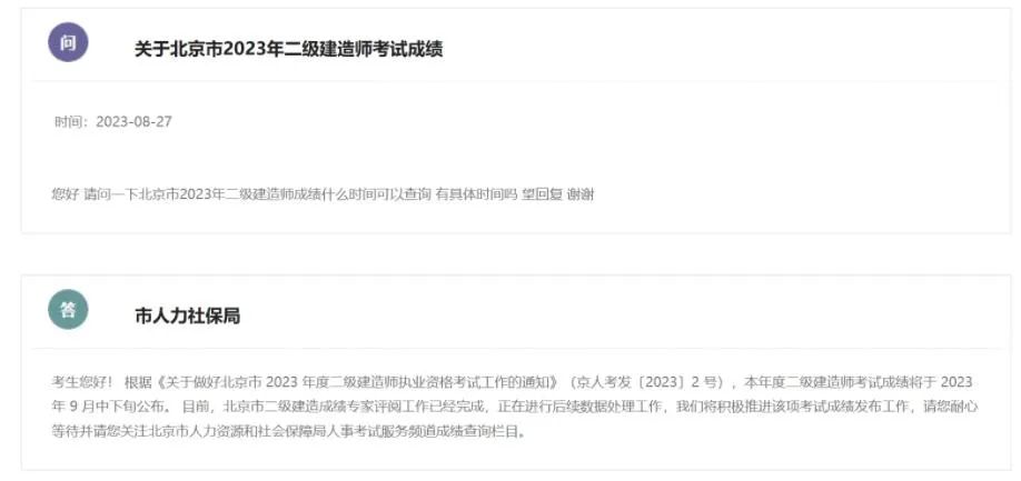 另外考生詢問:關于北京二建成績什么時候公布。官方回復:將于9月中下旬公布。