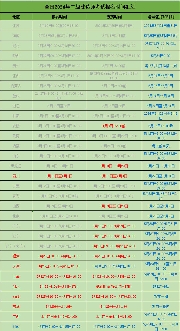31地區 二級建造師報名時間匯總