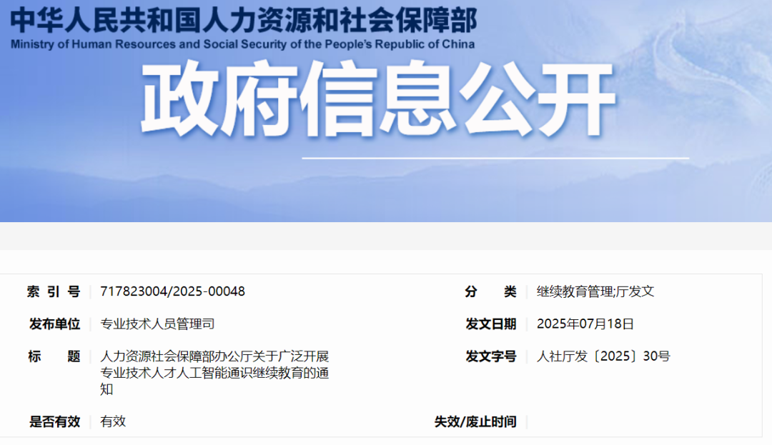 最近,人社部在官網發布了一則《關于廣泛開展專業技術人才人工智能通識繼續教育的通知》,要求全體專業技術人員開展人工智能通識繼續教育。