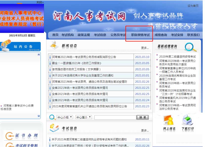 一、登錄河南人事考試網 點擊職稱資格考試 點擊進入http://www.hnrsks.com/Default.aspx