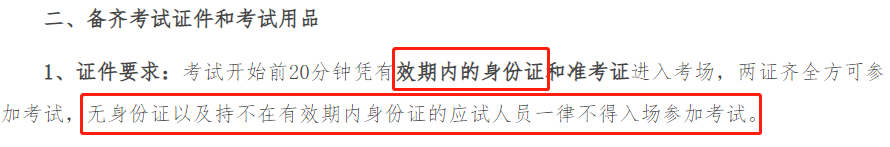 憑有效期內(nèi)的身份證和準(zhǔn)考證進(jìn)入考場,兩證齊全方可參加考試,無身份證以及持不在有效期內(nèi)身份證的應(yīng)試人員一律不得入場參加考試。