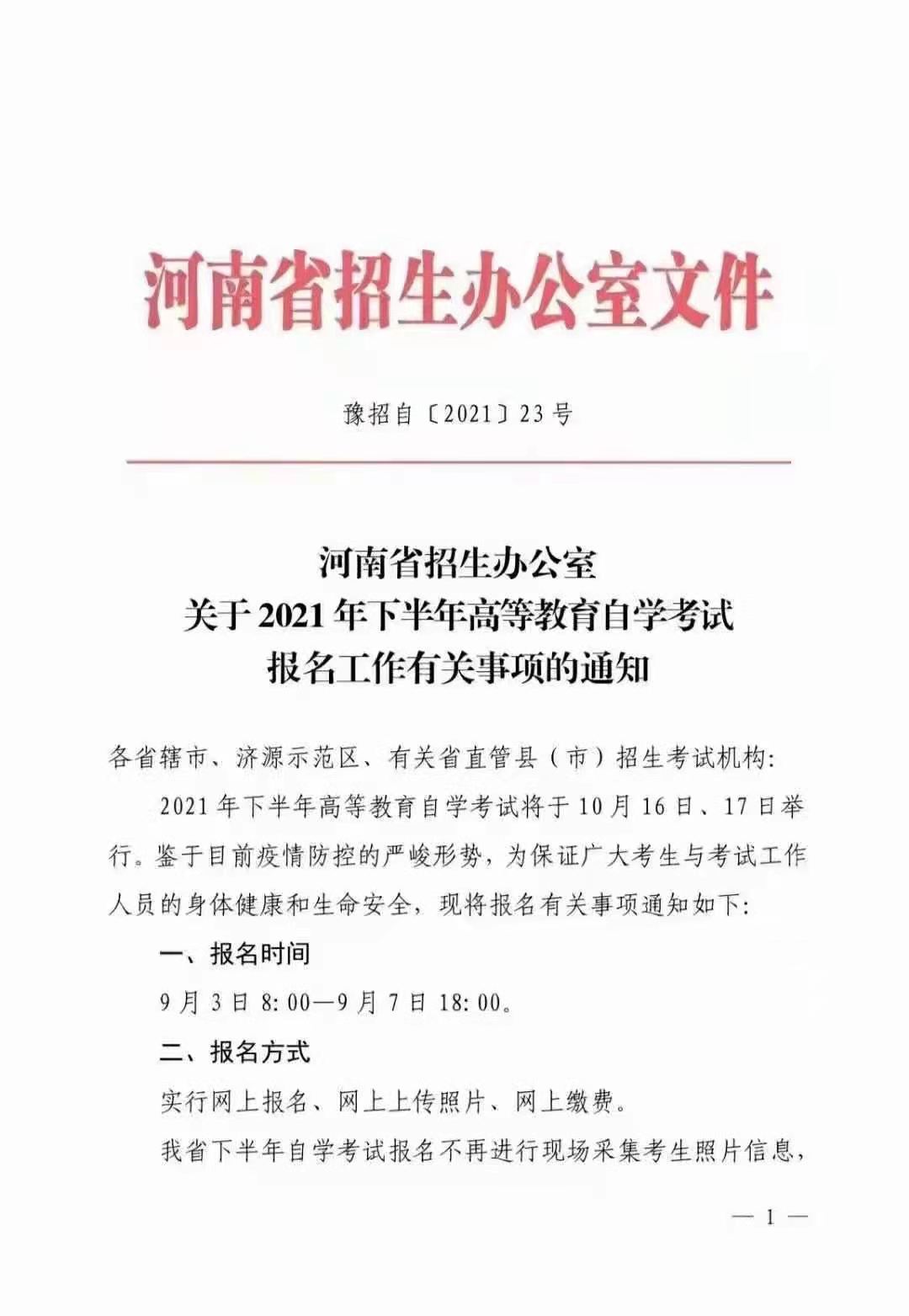 河南省招生辦公室發布【關于2021年下半年高等教育自學考試報名工作有關事項的通知】,明確2021年下半年高等教育自學考試將于10月16日、17日舉行,報名時間為9月3日——9月7日。