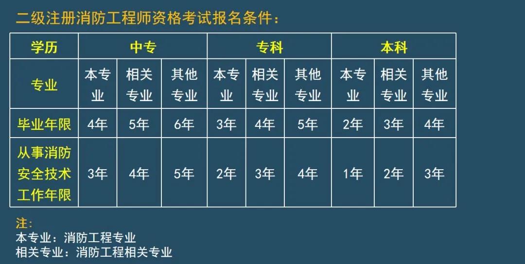 (二)取得消防工程專業(yè)大學(xué)專科學(xué)歷,從事消防安全技術(shù)工作滿2年;或者取得消防工程相關(guān)專業(yè)大學(xué)專科學(xué)歷,從事消防安全技術(shù)工作滿3年。