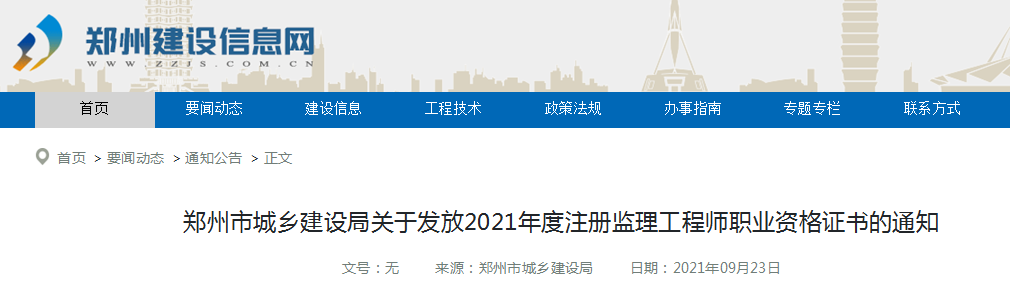 今日:鄭州建設(shè)信息網(wǎng)發(fā)布了《鄭州市城鄉(xiāng)建設(shè)局關(guān)于發(fā)放2021年度注冊監(jiān)理工程師職業(yè)資格證書的通知》,通知(《鄭州市城鄉(xiāng)建設(shè)局關(guān)于發(fā)放2021年度注冊監(jiān)理工程師職業(yè)資格證書的通知》以下簡稱通知)要求通過2021年注冊監(jiān)理工程師職業(yè)資格考試通過的考生請于9月27日起(工作日下午14:00-17:30)到鄭州市榆林北路6號鄭州市工程質(zhì)量監(jiān)督站409辦公室領(lǐng)取自己的證書,須本人領(lǐng)取,領(lǐng)取時(shí)攜帶本人身份證原件及復(fù)印件。聯(lián)系電話:0371-67881652,建議如必要請先撥打聯(lián)系電話確認(rèn),以免不必要的麻煩。