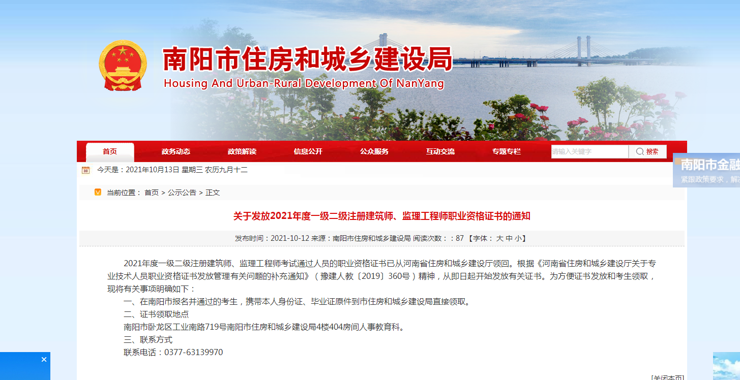 10月12日,南陽住房和城鄉(xiāng)建設局官網(wǎng)發(fā)布了《關于發(fā)放2021年度一級二級注冊建筑師、監(jiān)理工程師職業(yè)資格證書的通知》,南陽市2021年度一級二級注冊建筑師、監(jiān)理工程師考試通過人員的職業(yè)資格證書已從河南省住房和城鄉(xiāng)建設廳領回。根據(jù)《河南省住房和城鄉(xiāng)建設廳關于專業(yè)技術人員職業(yè)資格證書發(fā)放管理有關問題的補充通知》(豫建人教〔2019〕360號)精神,從即日(10月12日)起開始發(fā)放有關證書。為方便證書發(fā)放和考生領取,現(xiàn)將有關事項明確如下: