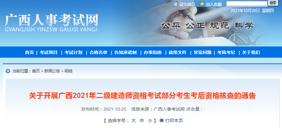 根據(jù)《關(guān)于2021年度廣西二級(jí)建造師執(zhí)業(yè)資格考試考務(wù)工作的通知》(桂人社辦發(fā)〔2021〕10號(hào))及《人力資源社會(huì)保障部人事考試中心關(guān)于印發(fā)<專業(yè)技術(shù)人員資格考試報(bào)名證明事項(xiàng)告知承諾制試點(diǎn)工作實(shí)施方案>的通知》(人考中心函〔2019〕26號(hào))精神,我院對(duì)考生的報(bào)考條件再次進(jìn)行審核,發(fā)現(xiàn)部分考生填寫和提交的學(xué)歷信息存在不一致的情況。為維護(hù)考試公平公正,保護(hù)考生權(quán)益,現(xiàn)將我區(qū)2021年二級(jí)建造師執(zhí)業(yè)資格考試部分考生考后資格核查有關(guān)事項(xiàng)通知如下:
