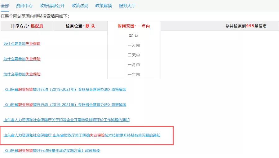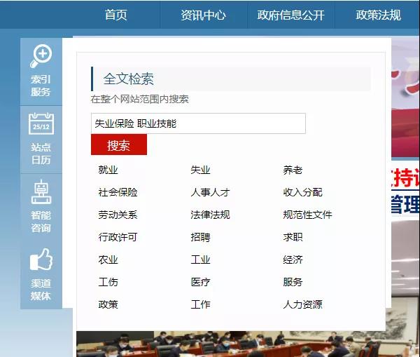 第二步,輸入失業(yè)保險、職業(yè)技能等關鍵詞進行搜索。