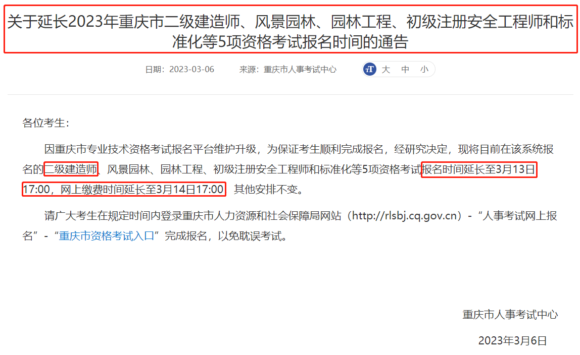 重慶:2023年二建報(bào)名繳費(fèi)時(shí)間延長(zhǎng)!