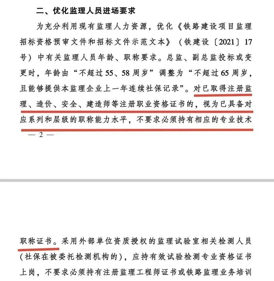 為充分利用現有監理人力資源,優化《鐵路建設項目監理招標資格預審文件和招標文件示范文本》(鐵建設[2021]17號)中有關監理人員年齡、職稱要求。