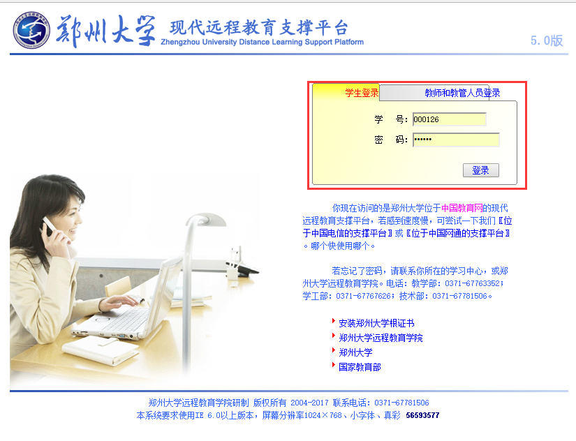 網上考試平臺學生登陸需要從鄭州大學現代遠程教育支撐平臺中跳轉。在瀏覽器地址欄中輸入http://dls.zzu.edu.cn/,進入鄭州大學現代遠程教育支撐平臺,在頁面的登錄框點擊“登陸”按鈕,鄭州大學現代遠程教育支撐平臺首頁登錄如下圖所示: