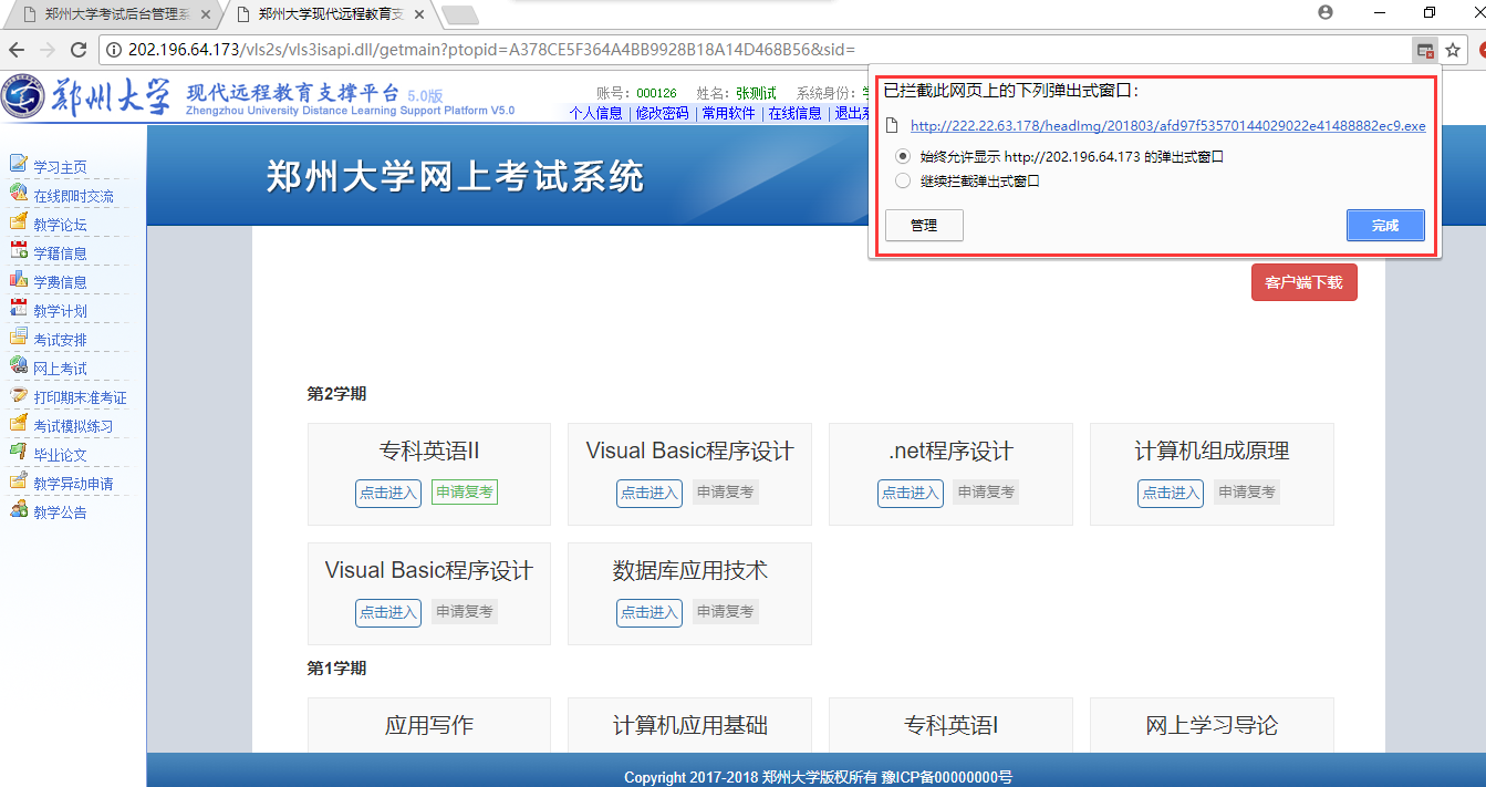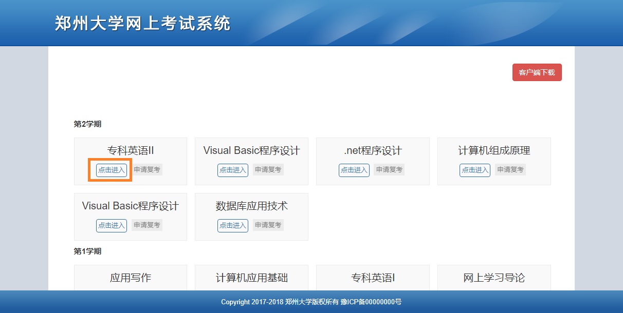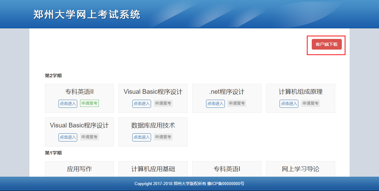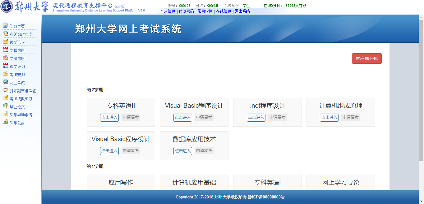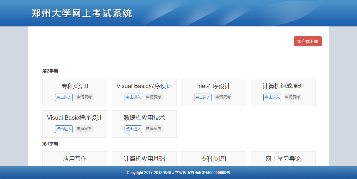 系統主要分為兩大部分,“在線練習”頁面和“在線考試”。在線練習部分采用網頁形式進行,在線考試需要下載客戶端并安裝,在客戶端內進行考試。首頁如下圖所示,有學生課程列表和客戶端下載功能。