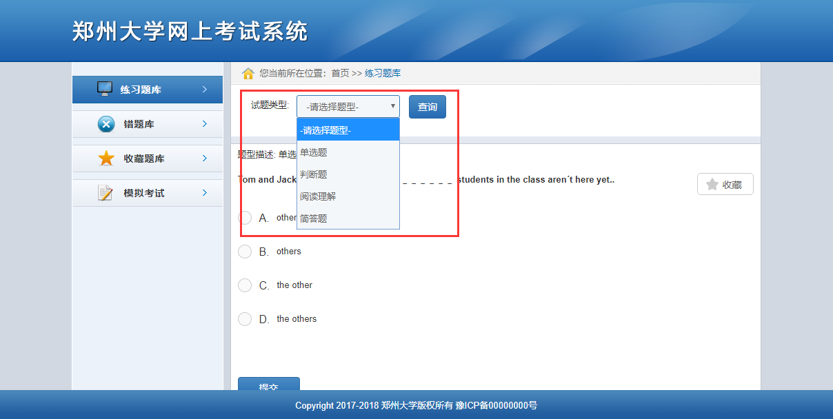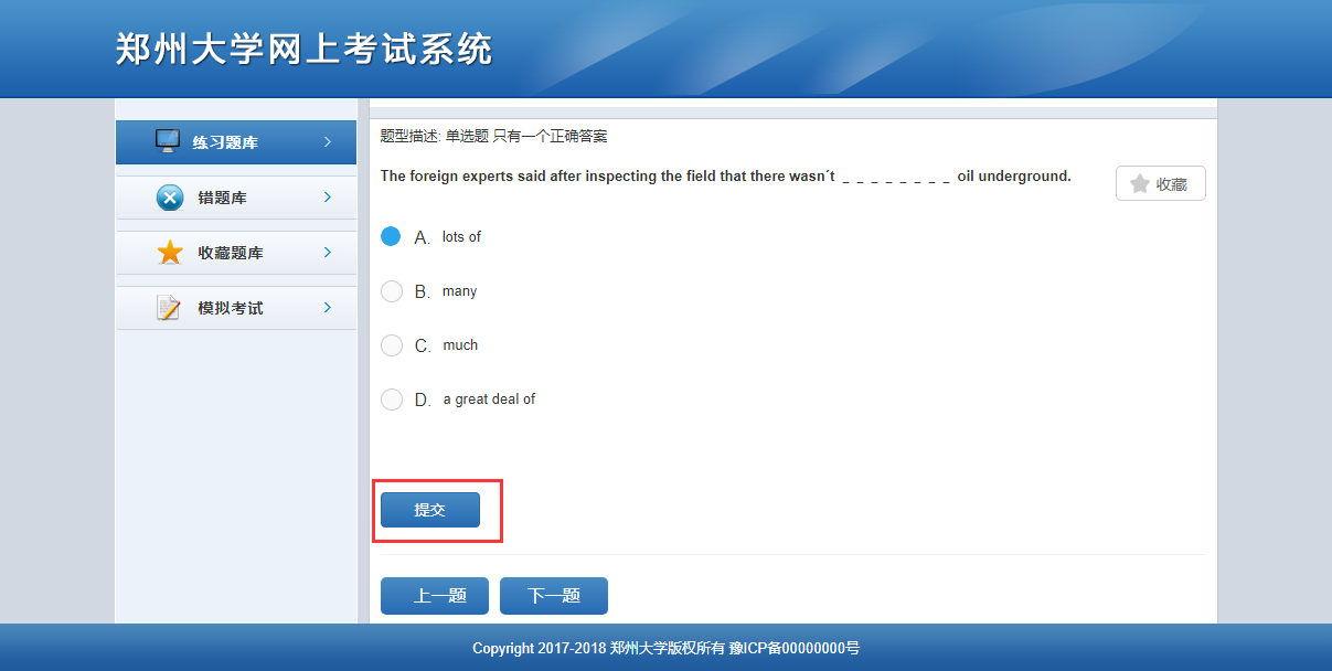 練習題庫采用單題練習的形式進行試題練習,可通過點擊【上一題】【下一題】進行試題切換。。試題練習可隨機進行答題或通過上方的試題類型下拉菜單選擇題型后點擊【查詢】篩選,針對某一類題型進行練習。如下圖所示: