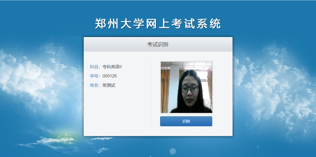 賬號密碼驗證通過后,考試系統還需要對考生面部進行識別,點擊【識別】按鈕,并按系統提示完成相應動作。系統在計時倒計時讀秒完成后確認考生為本人時方可進入考試,如下圖所示: