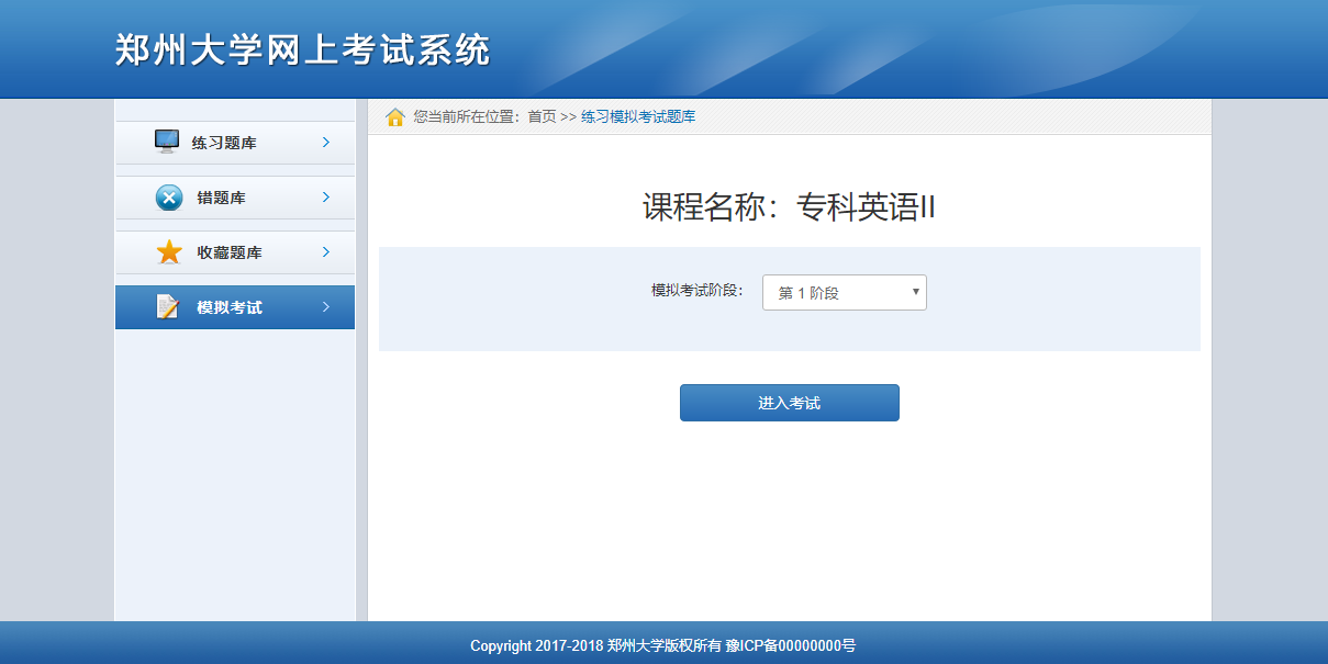 進入系統后,在系統左側菜單欄中選擇“考試模擬練習”,進入網上考試系統,如下圖所示:
