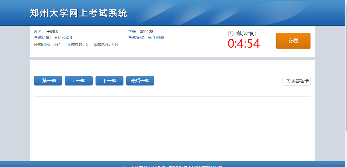 模擬考試頁面與正式考試一致,展示考生信息,考試倒計時,學生可模擬開啟/關閉答題卡,第一題,上一題,下一題,最后一題,交卷,提交成績等操作,學生可通過模【擬考試】練習考試時真實場景。