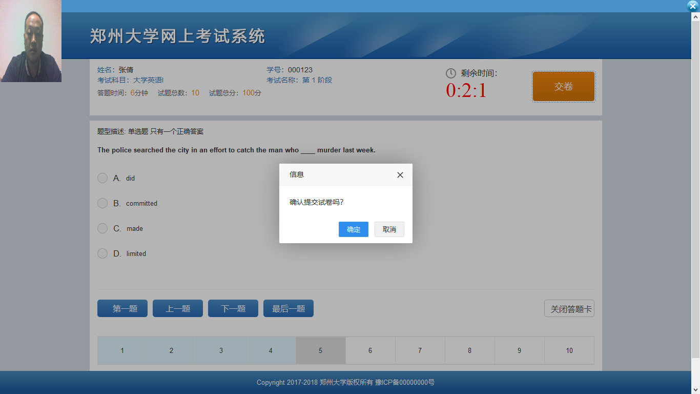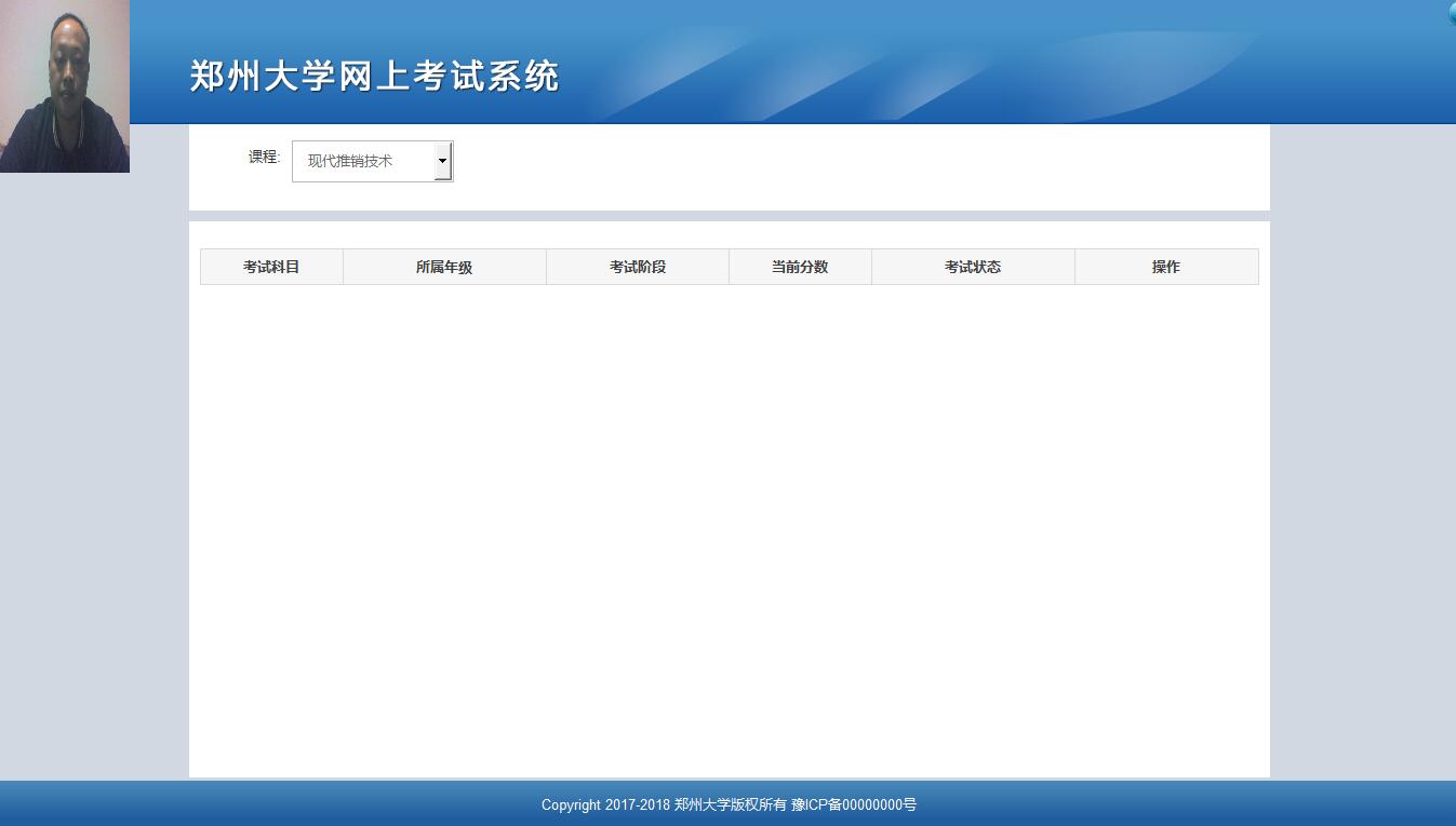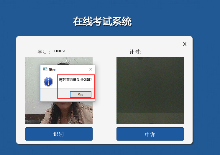 進入考試系統后,面部識別程序會全程監控考生行為,屏幕左上角為監控畫面。如果考試過程中出現異常情況(不是本人,多張人臉,沒有人)時,系統會給出相應提示,多次比對不通過的,系統會自動退出當前考試,本次考試作廢。如圖所示: