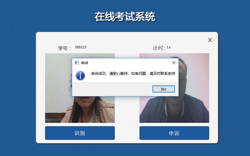 如本人識別不通過的情況下,可點擊【申訴】按鈕進行照片申訴,管理員審核通過后方可再次進行人臉識別比對,比對通過后方能進行網上考試。