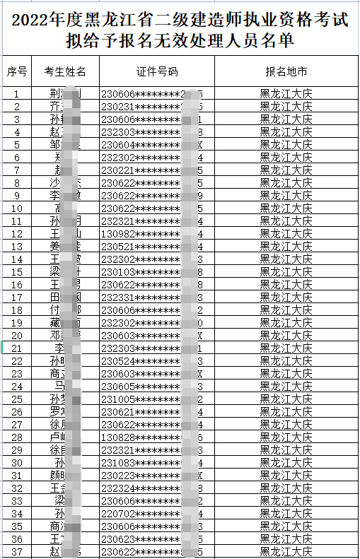 2022年度二級建造師執業資格考試網上報名工作已經結束。在對報考人員資格核查與監管過程中,發現510名報考人員(名單見附件)填報的所學專業與本次考試允許報名專業不符,屬于不符合報名條件情形。根據《關于2022年度二級建造師執業資格考試考務工作的通知》(黑人社辦發〔2022〕31號)規定,擬對上述不符合報名條件人員給予報名無效處理。