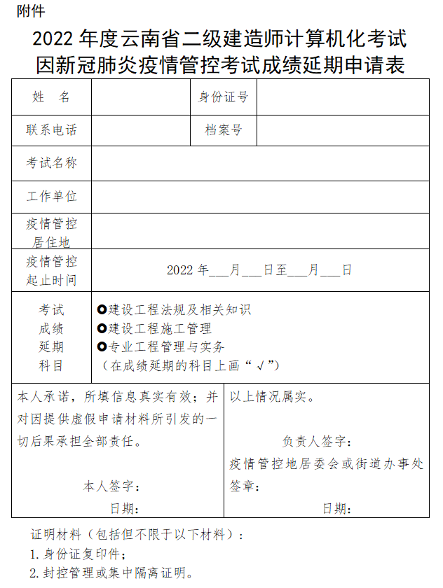 考生身份證正反面掃描件、準考證掃描件(PDF格式);云南健康碼、通信大數據行程卡截圖;上一年度成績單截圖;涉及考試期間的集中隔離(居家隔離)疫情管控證明;參與新冠肺炎疫情一線防控工作的工作證明;按要求填寫《2022年度云南省二級建造師計算機化考試因新冠肺炎疫情管控考試成績延期申請表》(詳見附件)。
