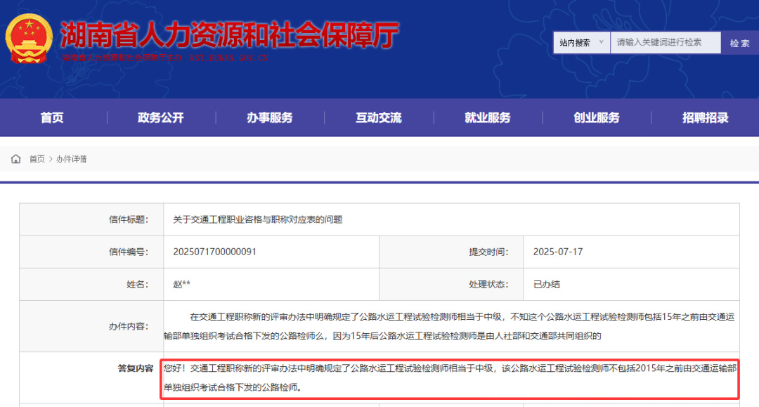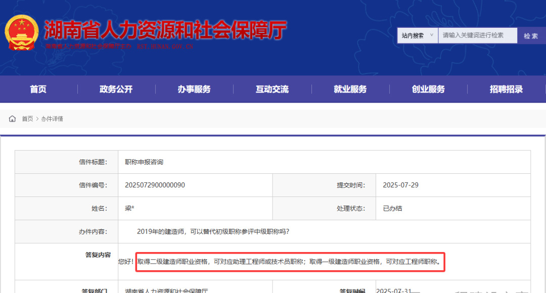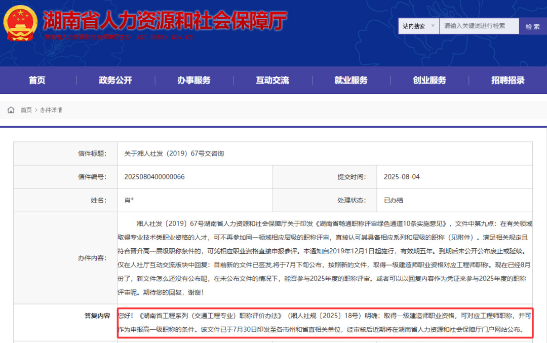 答復(fù):《湖南省工程系列(交通工程專業(yè))職稱評(píng)價(jià)辦法》(湘人社規(guī)(2025)18號(hào))明確:取得一級(jí)建造師職業(yè)資格,可對(duì)應(yīng)工程師職稱,并可作為申報(bào)高一級(jí)職稱的條件。該文件已于7月30日印發(fā)至各市州和省直相關(guān)單位,經(jīng)審核后近期將在湖南省人力資源和社會(huì)保障廳門戶網(wǎng)站公布。
