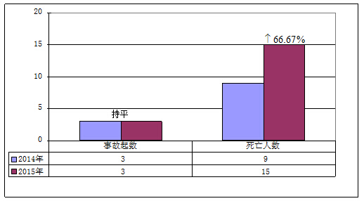 2015年7月,全國(guó)共發(fā)生房屋市政工程生產(chǎn)安全較大事故3起、死亡15人,與去年同期事故起數(shù)持平,死亡人數(shù)增加6人,同比上升66.67%(見圖4)。