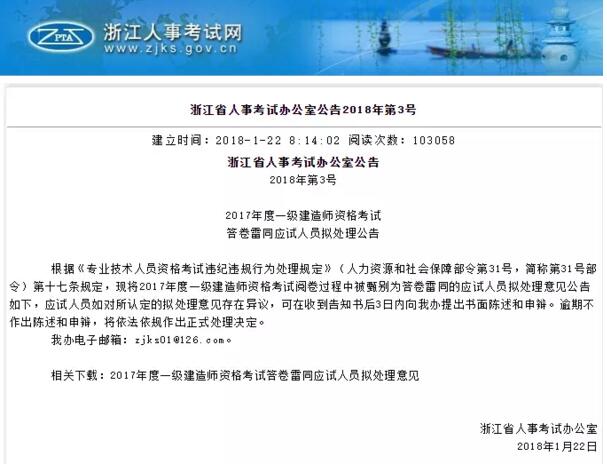 2017年度一級建造師資格考試答卷雷同應試人員擬處理公告