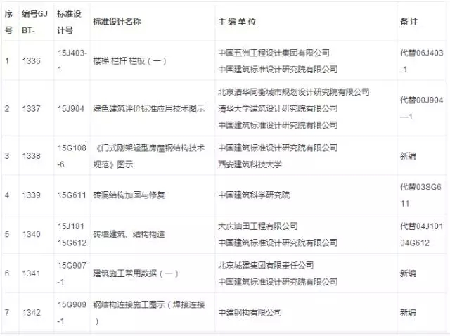 經審查,批準由中國建筑標準設計研究院有限公司等24個單位編制的《樓梯 欄桿 欄板(一)》等24項標準設計為國家建筑標準設計。該24項標準設計自2015年8月1日起實施。原《樓梯 欄桿 欄板(一)》(06J403-1)、《智能化示范小區設計》(00J904-1)、《磚混結構加固與修復》(03SG611)、《磚墻建筑構造》(04J101)、《磚墻結構構造》(04G612)、《太陽能集中熱水系統選用與安裝》(06SS128)、《室內消火栓安裝》(04S202)、《集氣罐制作及安裝》(94K402-1)、《熱水集中采暖分戶熱計量系統施工安裝》(04K502)、《建筑物防雷設施安裝》(99D501-1)、《等電位聯結安裝》(02D501-2)、《利用建筑物金屬體做防雷及接地裝置安裝》(03D501-3)、《城市道路—瀝青路面》(05MR201)、《城市道路—水泥混凝土路面》(05MR202)、《城市道路—軟土地基處理》(05MR301)、《城市道路—無障礙設計》(05MR501)標準設計同時廢止。