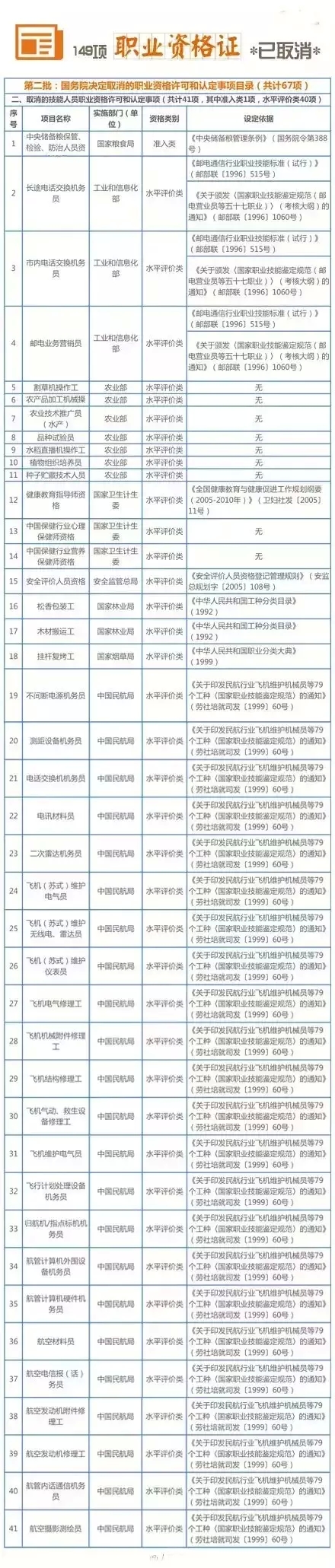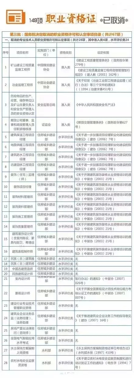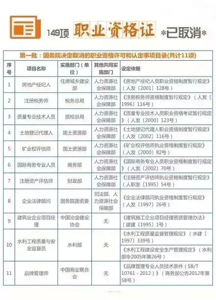 李克強(qiáng)總理在今年7月15日主持召開國務(wù)院常務(wù)會(huì)議。會(huì)議決定,在去年以來已取消149項(xiàng)職業(yè)資格的基礎(chǔ)上,再取消網(wǎng)絡(luò)廣告經(jīng)紀(jì)人、注冊(cè)電子貿(mào)易師、全國外貿(mào)業(yè)務(wù)員、港口裝卸工等62項(xiàng)職業(yè)資格。還將繼續(xù)集中取消職業(yè)資格許可和認(rèn)定事項(xiàng)。備考前要查清楚!