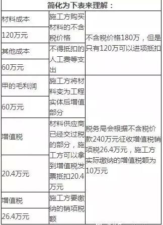 假定施工方除材料外每月其余費(fèi)用為10萬元(無法取得增值稅專用發(fā)票,均無法做進(jìn)項(xiàng)稅抵扣),那么施工方每月的進(jìn)項(xiàng)稅額=20×17%=3.4萬元,施工方每月的銷項(xiàng)稅額=40×11%=4.4萬元,所以施工方每月應(yīng)繳納的增值稅額=4.4-3.4=1萬元。